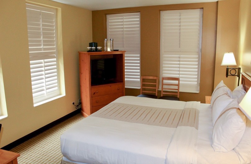 Freshly decorated in shades of cream, brown, and gold, this room features a king bed, custom plantation shutters, a refrigerator, and views of either the Alamo or tropical atrium.
